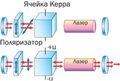Предположим теперь, что вместе постоянного электрического поля мы подаем на электроды переменное поле, которое периодически меняется от нуля до максимума. Тогда ячейка Керра превращается в предельно быстродействующий световой затвор, который работает с частотой, равной частоте изменения поля. При помощи простой по конструкции ячейки Керра можно производить прерывание света до 10000000000 раз в секунду.